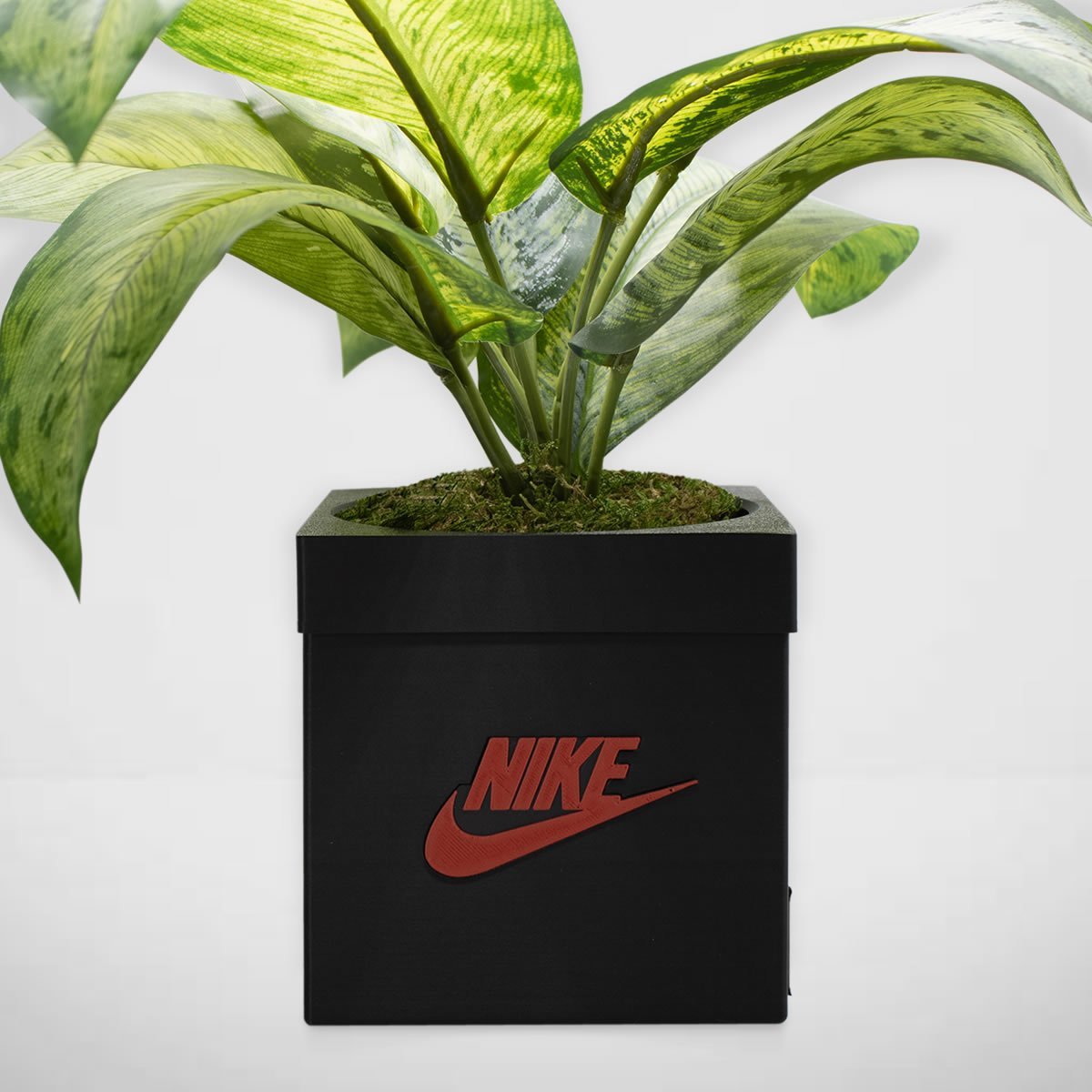 Compact planter in the shape of a sneaker box, designed for everyday use on desk, shelf, or entryway. Printed in PLA and finished clean, it includes a drainage hole. Dimensions: 4.7 in wide, 4.7 in tall, 4.5 in opening. Fits small foliage, succulents, or starter plants. Stable square footprint prevents tipping and keeps soil contained during watering. Minimal look matches modern and urban decor.
