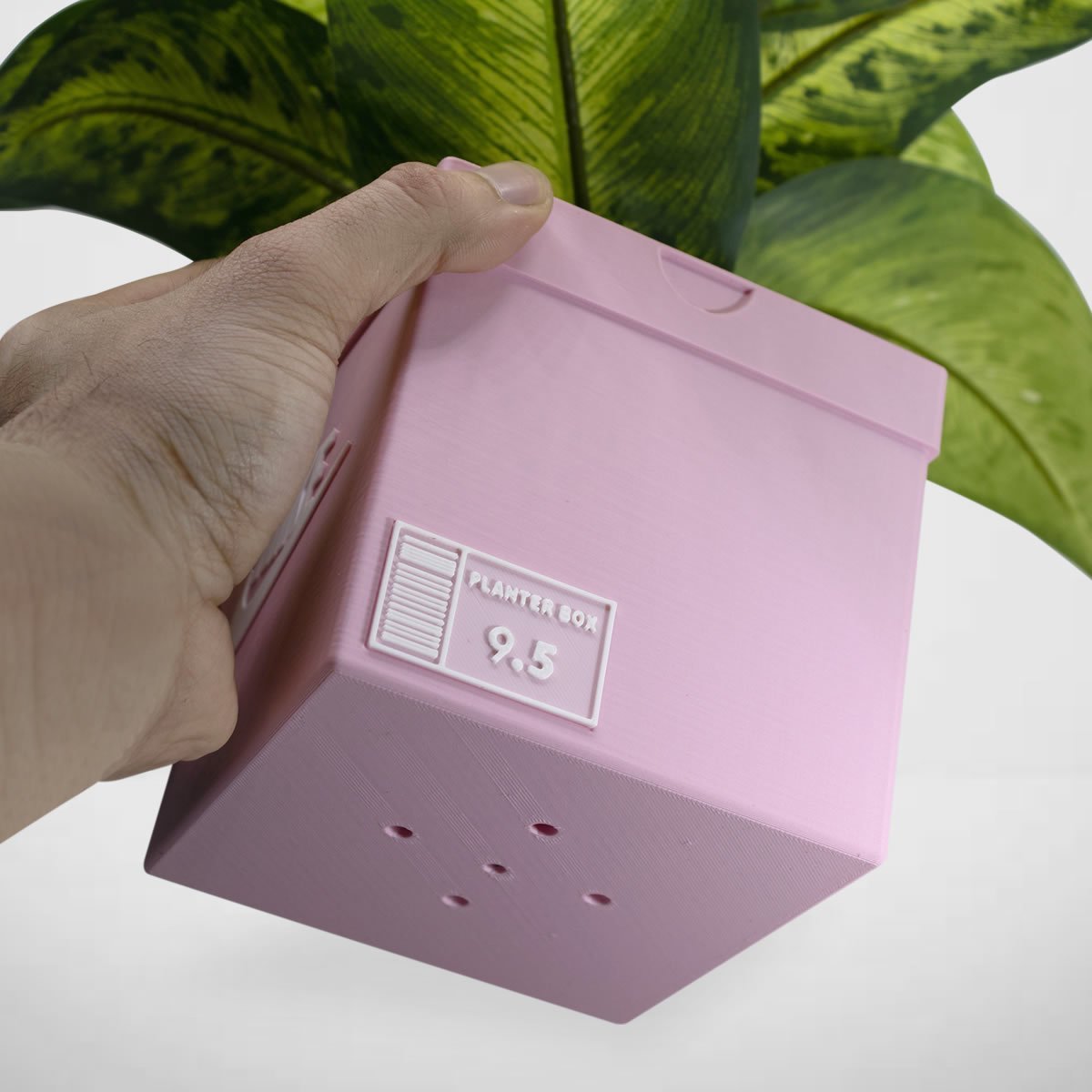 The sneakers box planter is a 3D printed container shaped like a shoe box with a built‑in drainage hole. It measures approximately 4.7 × 4.7 in with a 4.5 in opening and holds a 4 in nursery pot.